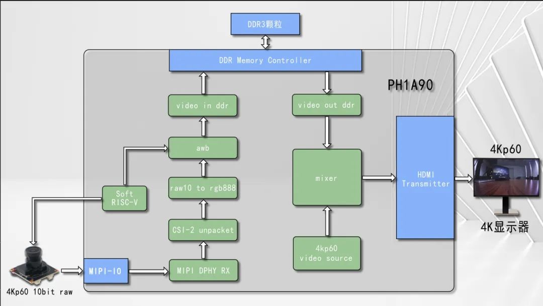 4001老百匯網站基于PH1A90器件開發了4K攝像頭圖像采集與實時顯示的典型應用,用于演示PH1A系列FPGA在攝像頭采集、圖像存儲以及視頻顯示領域的優越性能,整個演示環境包括PH1A90開發板,4K顯示器以及4k攝像頭,攝像頭輸出的視頻分辨率為4K60?。莞袷轎?0bit raw數據,輸出接口為MIPI CSI-2 4Lane。