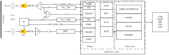基于EF2 FAGA+M3的激光測距系統,將基本外設接口激光功率控制,APD增益控制,PLL控制,ADC采樣,DFT,以及距離計算部分,全部放到FPGA邏輯內,M3硬核采用RTOS系統處理人機交互界面,電源管理,人機交互接口的工作,這樣做的好處是基本驅動和計算單元全部用邏輯實現,使處理過程需要的時間最小化。