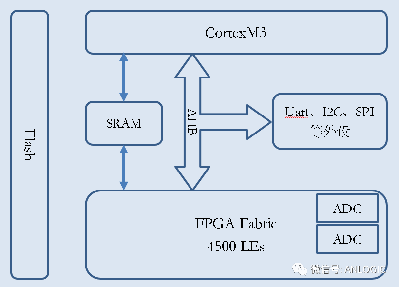 4001老百匯網站SoC是集成了 FPGA、MCU、ADC和Flash的單芯片系統,框圖如下: